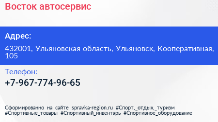 Восток, автосервис по адресу 432001, Ульяновская область, Ульяновск, Кооперативная, 105 в дальнейшем Организация, размещена в следующих категориях: