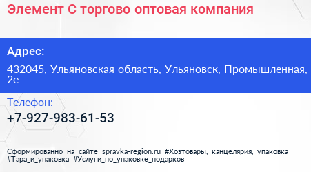 Элемент-С, торгово-оптовая компания по адресу 432045, Ульяновская область, Ульяновск, Промышленная, 2е в дальнейшем Организация, размещена в следующих категориях: