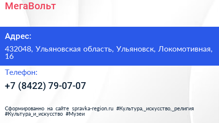 МегаВольт по адресу 432048, Ульяновская область, Ульяновск, Локомотивная, 16 в дальнейшем Организация, размещена в следующих категориях: