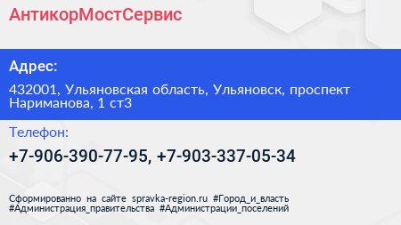 АнтикорМостСервис по адресу 432001, Ульяновская область, Ульяновск, проспект Нариманова, 1 ст3 в дальнейшем Организация, размещена в следующих категориях: