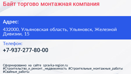 Байт, торгово-монтажная компания по адресу 432000, Ульяновская область, Ульяновск, Железной Дивизии, 15 в дальнейшем Организация, размещена в следующих категориях: