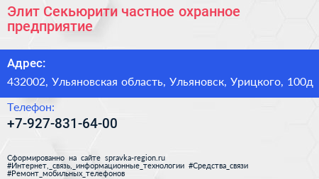 Элит Секьюрити, частное охранное предприятие по адресу 432002, Ульяновская область, Ульяновск, Урицкого, 100д в дальнейшем Организация, размещена в следующих категориях:
