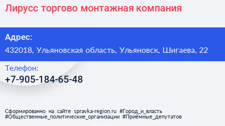Лирусс, торгово-монтажная компания по адресу 432018, Ульяновская область, Ульяновск, Шигаева, 22 в дальнейшем Организация, размещена в следующих категориях: