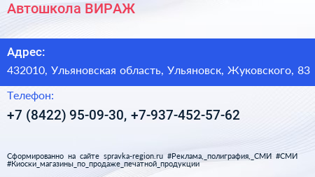Автошкола ВИРАЖ по адресу 432010, Ульяновская область, Ульяновск, Жуковского, 83 в дальнейшем Организация, размещена в следующих категориях: