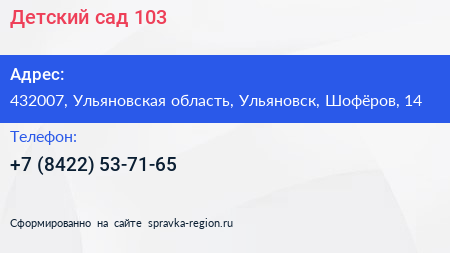Детский сад №103 по адресу 432007, Ульяновская область, Ульяновск, Шофёров, 14 в дальнейшем Организация, размещена в следующих категориях: