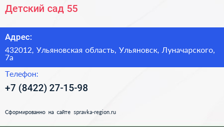 Детский сад №55 по адресу 432012, Ульяновская область, Ульяновск, Луначарского, 7а в дальнейшем Организация, размещена в следующих категориях: