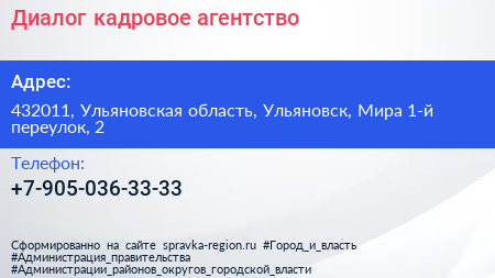 Диалог, кадровое агентство по адресу 432011, Ульяновская область, Ульяновск, Мира 1-й переулок, 2 в дальнейшем Организация, размещена в следующих категориях: