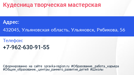 Кудесница, творческая мастерская по адресу 432045, Ульяновская область, Ульяновск, Рябикова, 56 в дальнейшем Организация, размещена в следующих категориях: