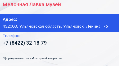 Мелочная Лавка, музей по адресу 432000, Ульяновская область, Ульяновск, Ленина, 76 в дальнейшем Организация, размещена в следующих категориях: