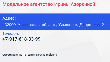 Модельное агентство Ирины Азоркиной по адресу 432000, Ульяновская область, Ульяновск, Дворцовая, 2 в дальнейшем Организация, размещена в следующих категориях:
