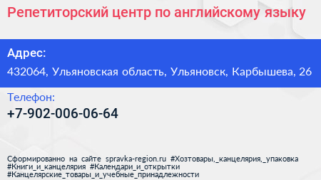 Репетиторский центр по английскому языку по адресу 432064, Ульяновская область, Ульяновск, Карбышева, 26 в дальнейшем Организация, размещена в следующих категориях:
