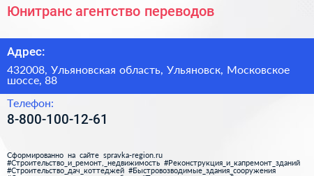Юнитранс, агентство переводов по адресу 432008, Ульяновская область, Ульяновск, Московское шоссе, 88 в дальнейшем Организация, размещена в следующих категориях: