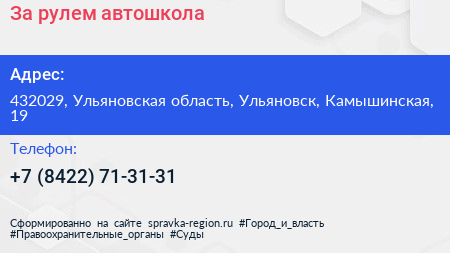 За рулем, автошкола по адресу 432029, Ульяновская область, Ульяновск, Камышинская, 19 в дальнейшем Организация, размещена в следующих категориях: