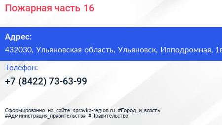 Пожарная часть №16 по адресу 432030, Ульяновская область, Ульяновск, Ипподромная, 1в в дальнейшем Организация, размещена в следующих категориях: