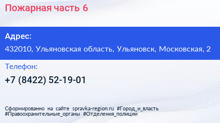 Пожарная часть №6 по адресу 432010, Ульяновская область, Ульяновск, Московская, 2 в дальнейшем Организация, размещена в следующих категориях: