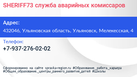 SHERIFF73, служба аварийных комиссаров по адресу 432046, Ульяновская область, Ульяновск, Мелекесская, 4 в дальнейшем Организация, размещена в следующих категориях: