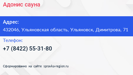 Адонис, сауна по адресу 432046, Ульяновская область, Ульяновск, Димитрова, 71 в дальнейшем Организация, размещена в следующих категориях: