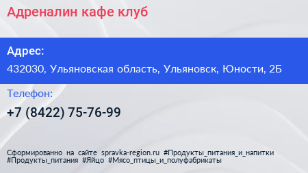 Адреналин, кафе-клуб по адресу 432030, Ульяновская область, Ульяновск, Юности, 2Б в дальнейшем Организация, размещена в следующих категориях: