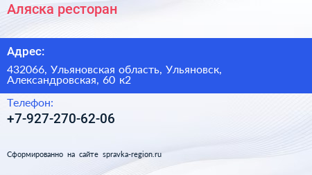 Аляска, ресторан по адресу 432066, Ульяновская область, Ульяновск, Александровская, 60 к2 в дальнейшем Организация, размещена в следующих категориях: