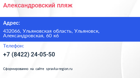 Александровский пляж по адресу 432066, Ульяновская область, Ульяновск, Александровская, 60 к6 в дальнейшем Организация, размещена в следующих категориях: