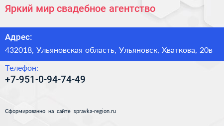 Яркий мир, свадебное агентство по адресу 432018, Ульяновская область, Ульяновск, Хваткова, 20в в дальнейшем Организация, размещена в следующих категориях: