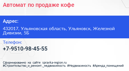Автомат по продаже кофе по адресу 432017, Ульяновская область, Ульяновск, Железной Дивизии, 5Б в дальнейшем Организация, размещена в следующих категориях:
