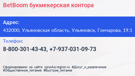 BetBoom, букмекерская контора по адресу 432000, Ульяновская область, Ульяновск, Гончарова, 19.1 в дальнейшем Организация, размещена в следующих категориях: