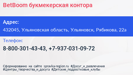 BetBoom, букмекерская контора по адресу 432045, Ульяновская область, Ульяновск, Рябикова, 22а в дальнейшем Организация, размещена в следующих категориях: