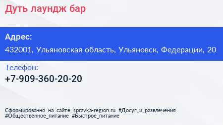 Дуть, лаундж-бар по адресу 432001, Ульяновская область, Ульяновск, Федерации, 20 в дальнейшем Организация, размещена в следующих категориях: