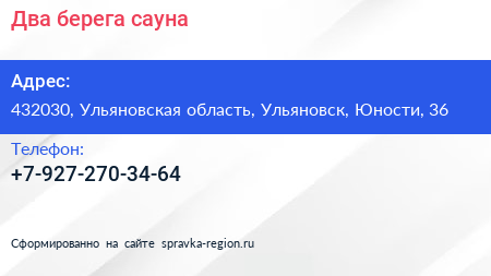 Два берега, сауна по адресу 432030, Ульяновская область, Ульяновск, Юности, 36 в дальнейшем Организация, размещена в следующих категориях: