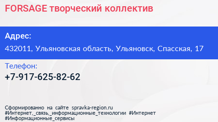 FORSAGE, творческий коллектив по адресу 432011, Ульяновская область, Ульяновск, Спасская, 17 в дальнейшем Организация, размещена в следующих категориях: