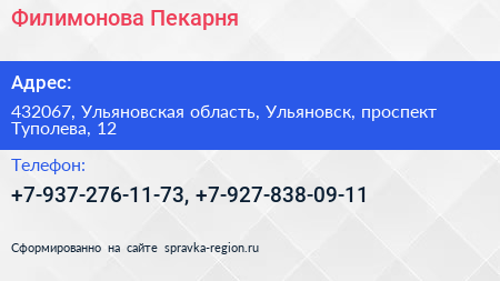 Филимонова Пекарня по адресу 432067, Ульяновская область, Ульяновск, проспект Туполева, 12 в дальнейшем Организация, размещена в следующих категориях: