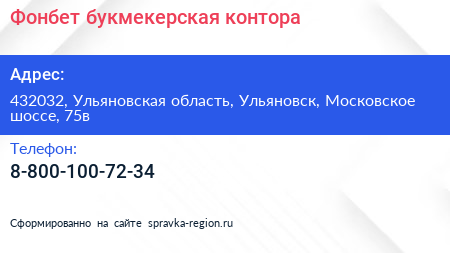 Фонбет, букмекерская контора по адресу 432032, Ульяновская область, Ульяновск, Московское шоссе, 75в в дальнейшем Организация, размещена в следующих категориях: