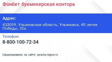 Фонбет, букмекерская контора по адресу 432059, Ульяновская область, Ульяновск, 40 летия Победы, 31а в дальнейшем Организация, размещена в следующих категориях: