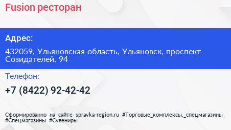 Fusion, ресторан по адресу 432059, Ульяновская область, Ульяновск, проспект Созидателей, 94 в дальнейшем Организация, размещена в следующих категориях:
