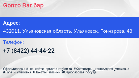 Gonzo Bar, бар по адресу 432011, Ульяновская область, Ульяновск, Гончарова, 48 в дальнейшем Организация, размещена в следующих категориях: