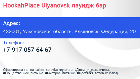HookahPlace Ulyanovsk, лаундж-бар по адресу 432001, Ульяновская область, Ульяновск, Федерации, 20 в дальнейшем Организация, размещена в следующих категориях: