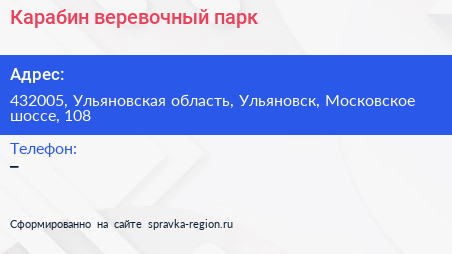 Карабин, веревочный парк по адресу 432005, Ульяновская область, Ульяновск, Московское шоссе, 108 в дальнейшем Организация, размещена в следующих категориях: