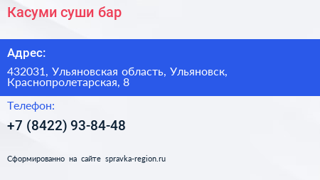 Касуми, суши-бар по адресу 432031, Ульяновская область, Ульяновск, Краснопролетарская, 8 в дальнейшем Организация, размещена в следующих категориях: