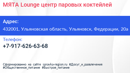 МЯТА Lounge, центр паровых коктейлей по адресу 432001, Ульяновская область, Ульяновск, Федерации, 20а в дальнейшем Организация, размещена в следующих категориях: