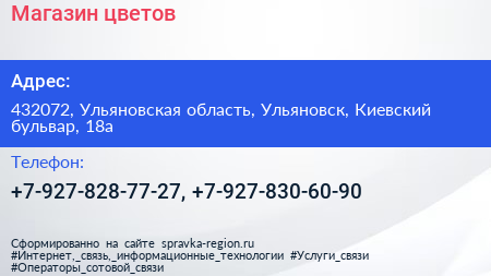 Магазин цветов по адресу 432072, Ульяновская область, Ульяновск, Киевский бульвар, 18а в дальнейшем Организация, размещена в следующих категориях: