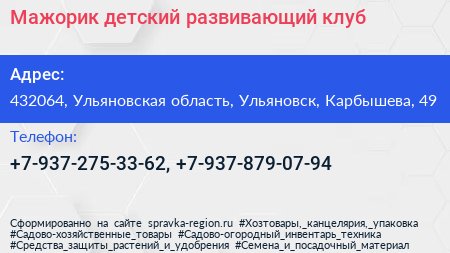 Мажорик, детский развивающий клуб по адресу 432064, Ульяновская область, Ульяновск, Карбышева, 49 в дальнейшем Организация, размещена в следующих категориях: