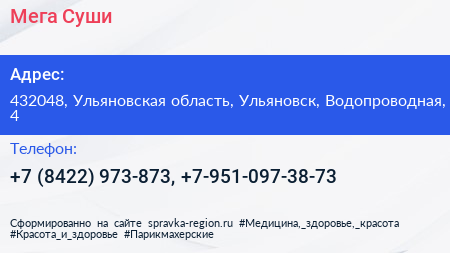 Мега Суши по адресу 432048, Ульяновская область, Ульяновск, Водопроводная, 4 в дальнейшем Организация, размещена в следующих категориях: