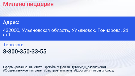 Милано, пиццерия по адресу 432000, Ульяновская область, Ульяновск, Гончарова, 21 ст1 в дальнейшем Организация, размещена в следующих категориях: