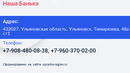 Наша Банька по адресу 432027, Ульяновская область, Ульяновск, Тимирязева, 48а ст1 в дальнейшем Организация, размещена в следующих категориях: