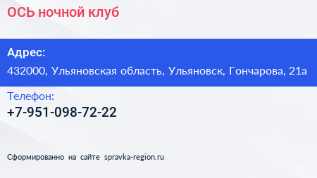 ОСЬ, ночной клуб по адресу 432000, Ульяновская область, Ульяновск, Гончарова, 21а в дальнейшем Организация, размещена в следующих категориях: