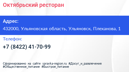 Октябрьский, ресторан по адресу 432000, Ульяновская область, Ульяновск, Плеханова, 1 в дальнейшем Организация, размещена в следующих категориях:
