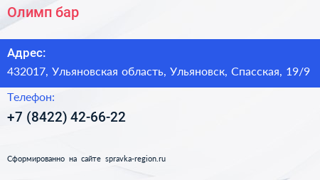 Олимп, бар по адресу 432017, Ульяновская область, Ульяновск, Спасская, 19/9 в дальнейшем Организация, размещена в следующих категориях:
