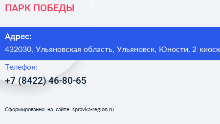 ПАРК ПОБЕДЫ по адресу 432030, Ульяновская область, Ульяновск, Юности, 2 киоск в дальнейшем Организация, размещена в следующих категориях: