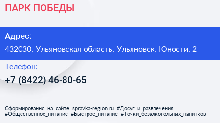 ПАРК ПОБЕДЫ по адресу 432030, Ульяновская область, Ульяновск, Юности, 2 в дальнейшем Организация, размещена в следующих категориях: